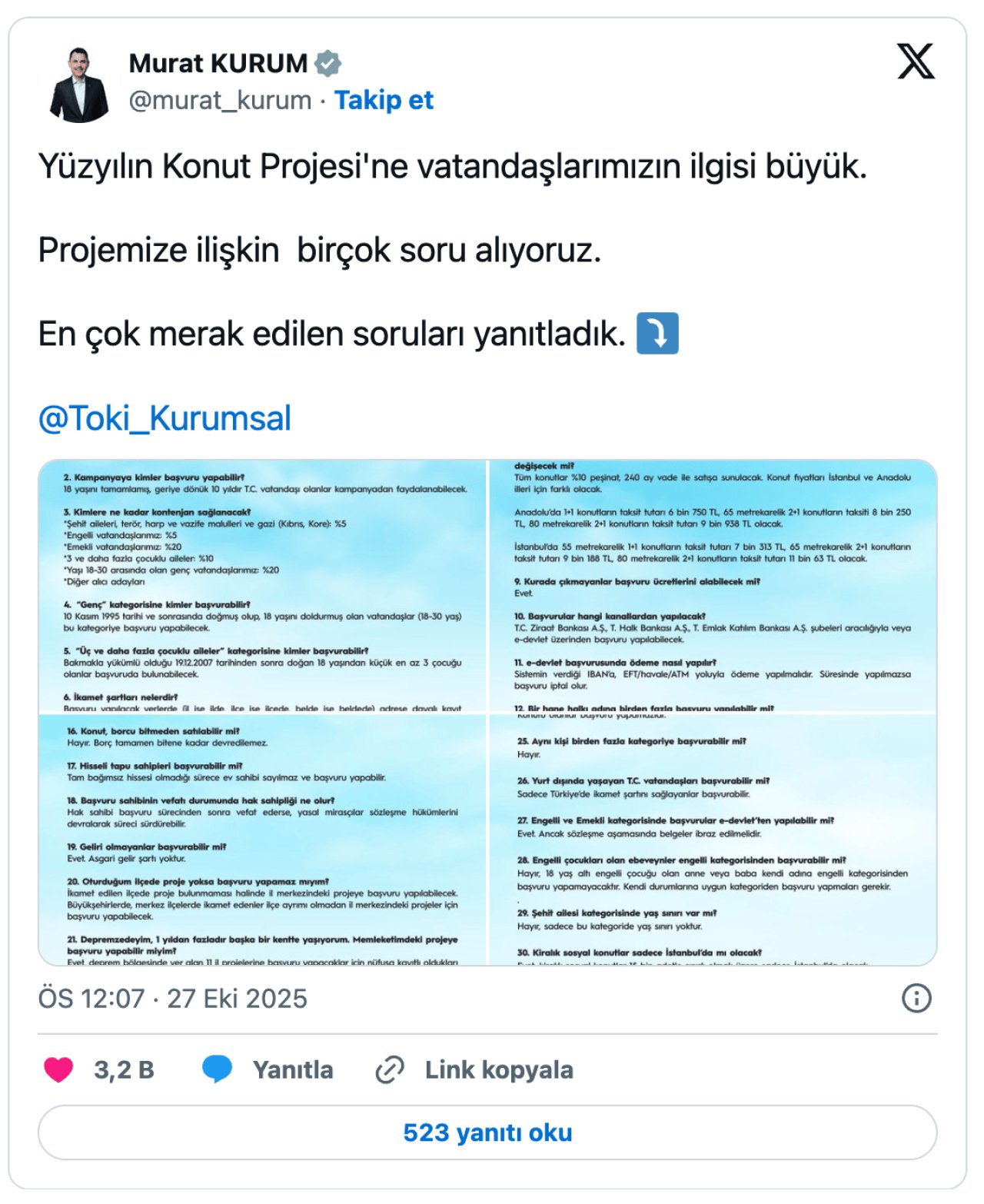 Çevre, Şehircilik ve İklim Değişikliği Bakanı Murat Kurum, sosyal medya hesabından Türkiye genelinde inşa edilecek 500 bin sosyal konut projesine dair önemli açıklamalarda bulundu. Bakan Kurum, “Yüzyılın Konut Projesi’ne vatandaşlarımızın ilgisi büyük. Projemize ilişkin birçok soru alıyoruz. En çok merak edilen soruları yanıtladık” ifadelerini kullandı.