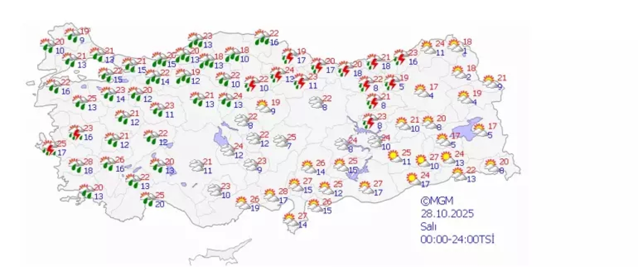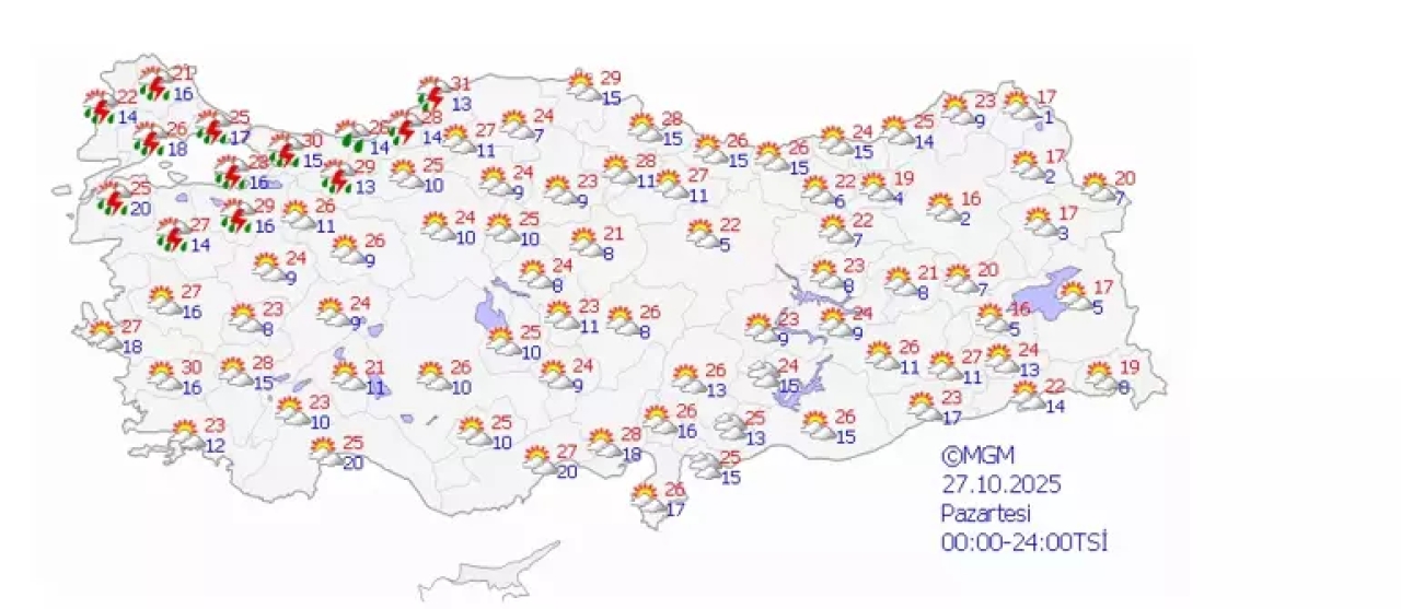 AKOM’un açıklamasına göre, öğle saatlerinden itibaren rüzgarın kuvvetlenerek fırtına şeklinde eseceği, Silivri ve Çatalca’dan başlayarak salı akşamına kadar gök gürültülü sağanakların etkili olacağı belirtildi. Sıcaklıkların 25 dereceden 15-17 dereceye kadar gerilemesi bekleniyor.